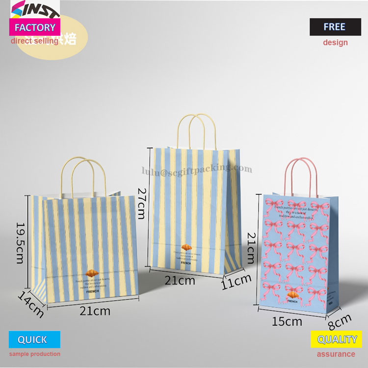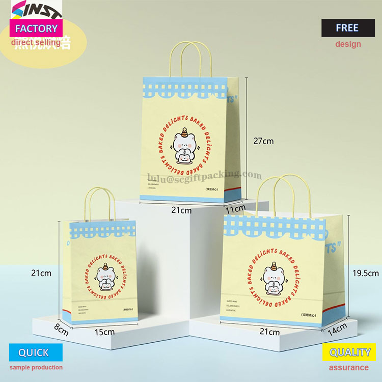 SINST Printing and Packaging Company uses paper tote bag material, with the main body selected in beige/light yellow, and the bag mouth decorated with light blue wave pattern. It is paired with a striking yellow rope shaped handle, which balances practicality and delicacy from touch to vision, and details show care. Let the customer feel happy when they see this packaging bag.