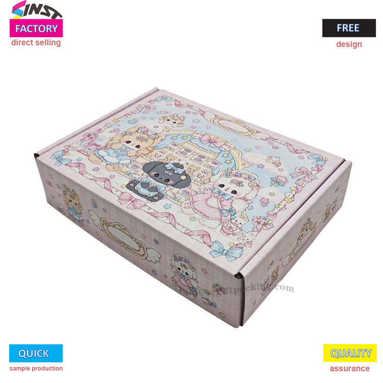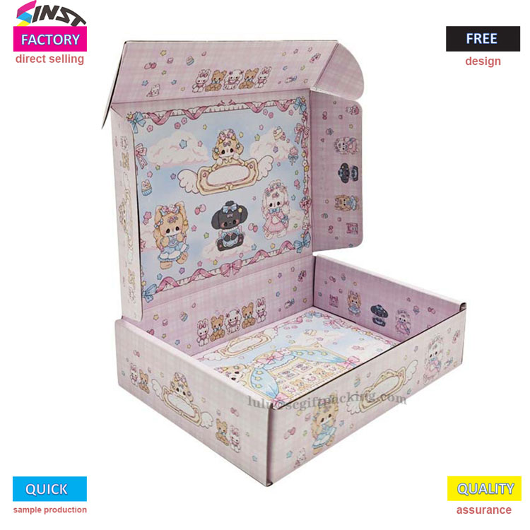 A colorida caixa de avião de papel de papelão ondulado para roupas possui um esquema de cores rosa doce com detalhes em azul claro. A caixa está cheia de elementos de desenhos animados, como guirlandas de flores, pequenos animais, arcos, nuvens e corações, criando um estilo sonhador e fofo. Da aparência ao serviço, ele capacita totalmente as embalagens de roupas e aprimora o apelo da marca.