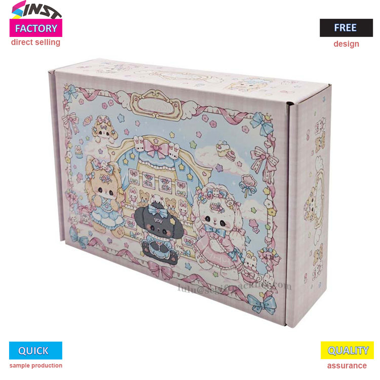 Esta é uma caixa de avião de papel ondulado colorido para roupas que apresentam um estilo doce e fofo. O material é papelão ondulado e o esquema de cores geral é predominantemente rosa, tornando -o adequado para combinar com vários estilos de roupas macias e fofas. Após a abertura, você pode até descobrir a ingenuidade - o substrato dentro da caixa também é preenchido com padrões de desenhos animados, com cachorros, gatos sentados ou deitados, cercados por elementos macios, como nuvens e corações. O estilo de padrão dentro e fora é unificado, simples, mas agradável o suficiente.