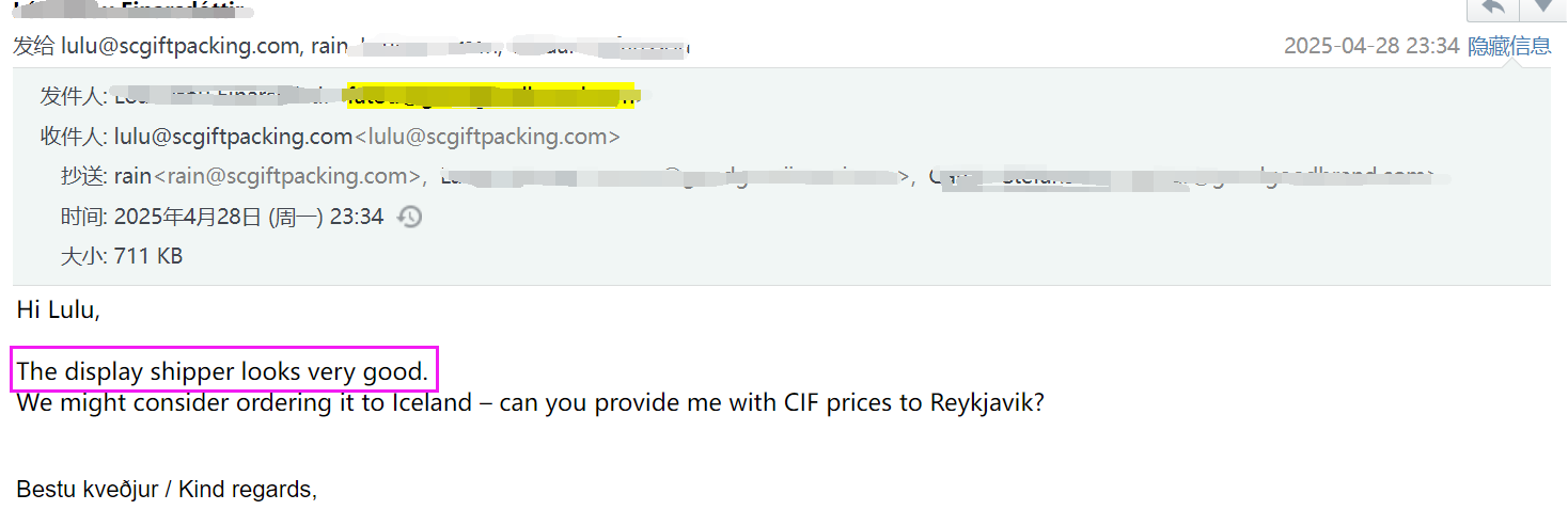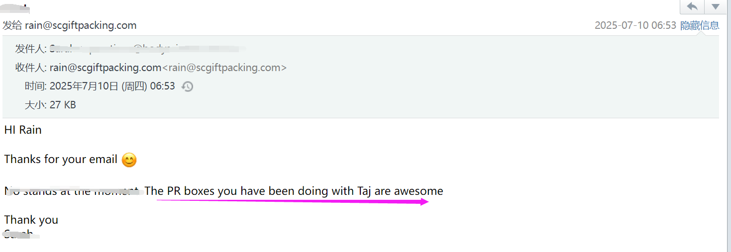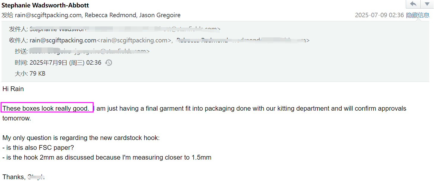 Emily acabou de completar um lote de pedidos de caixa de presente na semana passada. Ela disse: "O que precisamos não são caixas comuns, mas 'produtos de mídia social' que podem fazer o coração dos consumidores voar de relance". O pedido final foi aumentado em 30%e ela também enviou uma nota por e -mail dizendo: "Para a coleção da primavera do próximo ano, consideramos sua produtividade de design apenas