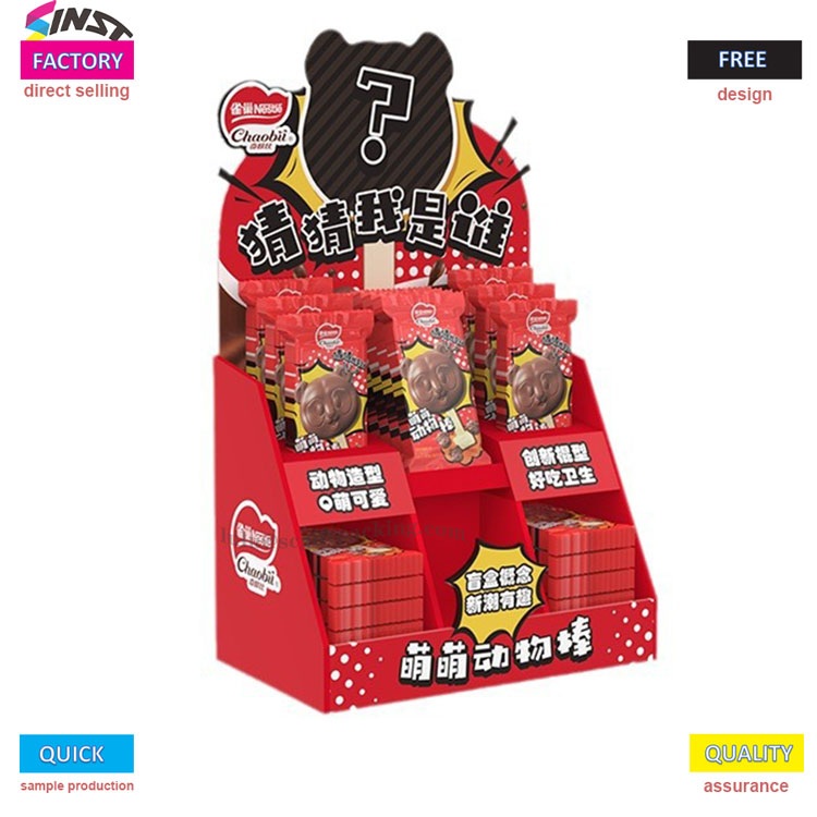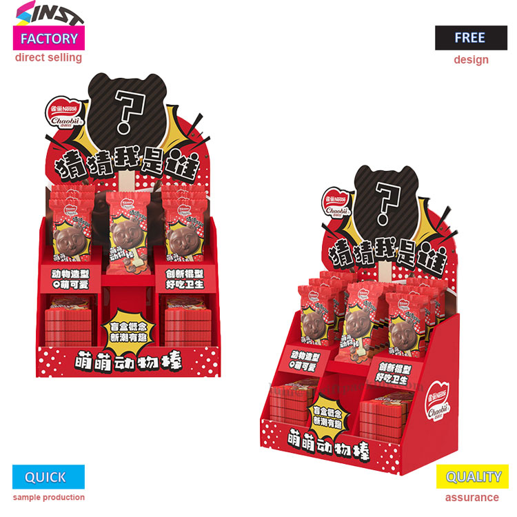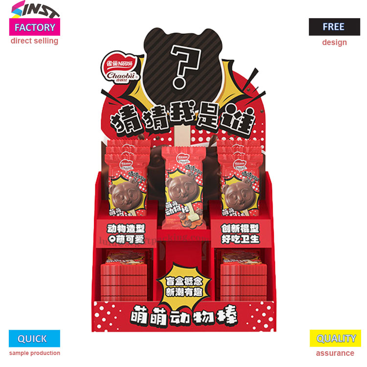 Esta caixa de exibição PDQ PDQ Snack Cardboard apresenta um esquema de cores vermelho brilhante e um design fofo e divertido. A caixa exibe lanches em forma de animal vermelho (impresso com padrões fofos de animais de estimação) em várias camadas, com foco em "q fofinho em forma de animal", "tipo de comida inovadora deliciosa e higiênica" e "Blind Box Concept Trendy". Atrai com precisão famílias que amam os animais e é uma ferramenta divertida de marketing para exibições de terminais atraentes.