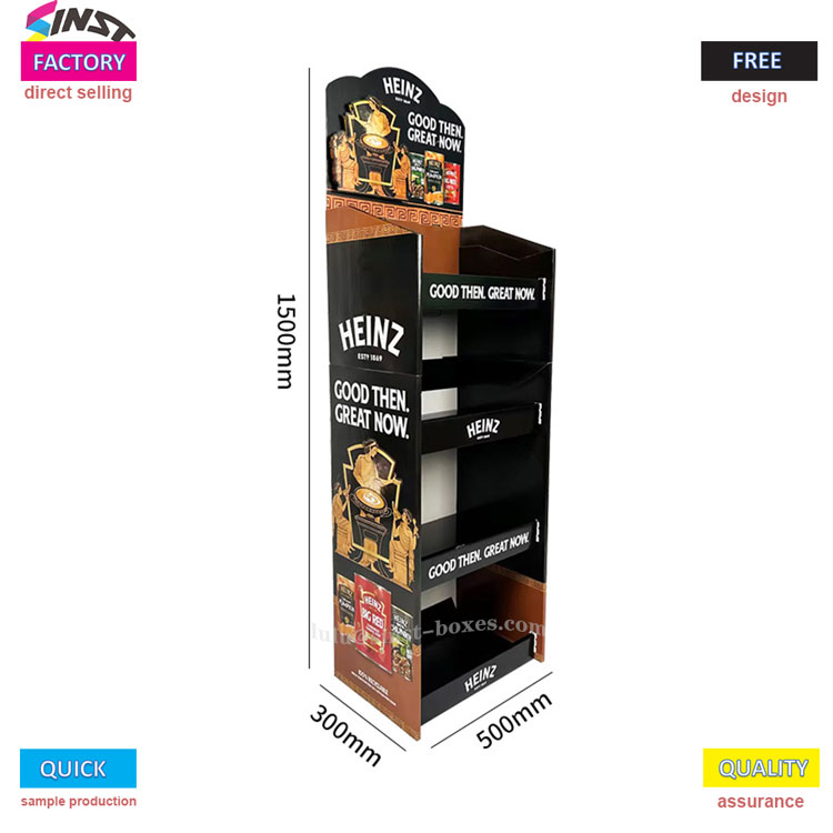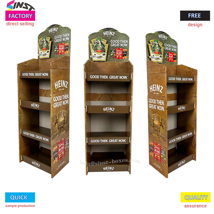 Este expositor de molho de tomate é um "ajudante" para supermercados e lojas de conveniência exporem molho. Pertence a um tipo de expositor de molhos, feito de expositor de papel cartão, que é leve e fácil de transportar. Pode ser utilizado assim que for desembalado e colocado sobre a bancada. A prateleira é dividida em quatro camadas, cada camada pode conter duas fileiras de garrafas de molho de tomate, e também pode haver algum molho para salada e molho doce e picante recheado ao lado - é chamada de "prateleira de exibição de molho de tomate", mas também pode ser usado como prateleira de molho. É adequado colocá-lo na área de temperos de um pequeno supermercado.