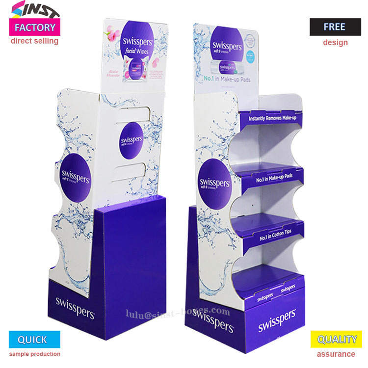 O expositor de lenços umedecidos foi projetado com múltiplas camadas, cada uma com ranhuras para segurar com segurança pequenos itens, como lenços umedecidos e cotonetes, facilitando o acesso. O material é papelão, leve e fácil de arrumar, além de fácil de reabastecer. Pertence ao tipo de ferramenta de exibição que parece simples e permanece firme quando usada.